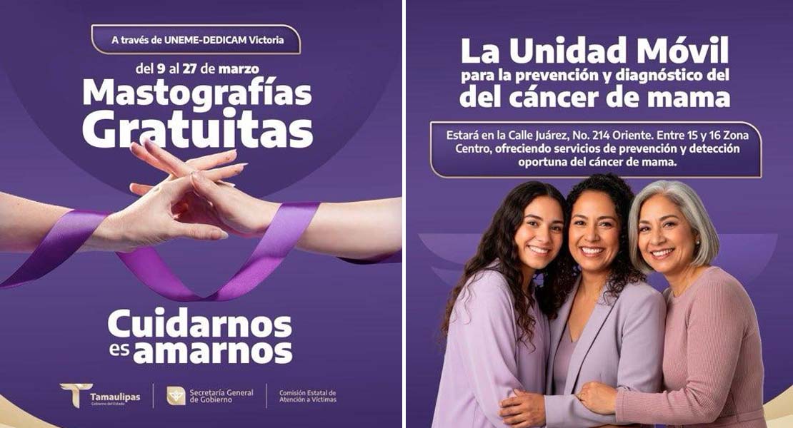 Ciudad Victoria, Tamaulipas (25-Febrero-2026).- La Comisión Estatal de Atención a Víctimas de Tamaulipas (CEAV Tamaulipas), mediante la unidad móvil de la UNEME-DEDICAM Victoria, convoca a la población a sumarse a la Jornada de Mastografías Gratuitas, que se realizará del 9 al 13 de marzo, en un horario de 9:00 a 15:00 horas, en sus oficinas centrales ubicadas en Calle Benito Juárez 214, Zona Centro, en Ciudad Victoria, Tamaulipas.