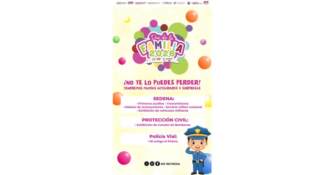 Reynosa, Tam (28-Febrero-2026).- El Alcalde, Carlos Peña Ortiz, a través del Sistema DIF Municipal que preside Carlos Luis Peña Garza, llevará a cabo el Día de la Familia, un evento especial con música, alegría y mucha diversión enfocado en fortalecer los lazos de amor y cariño con los seres queridos.
