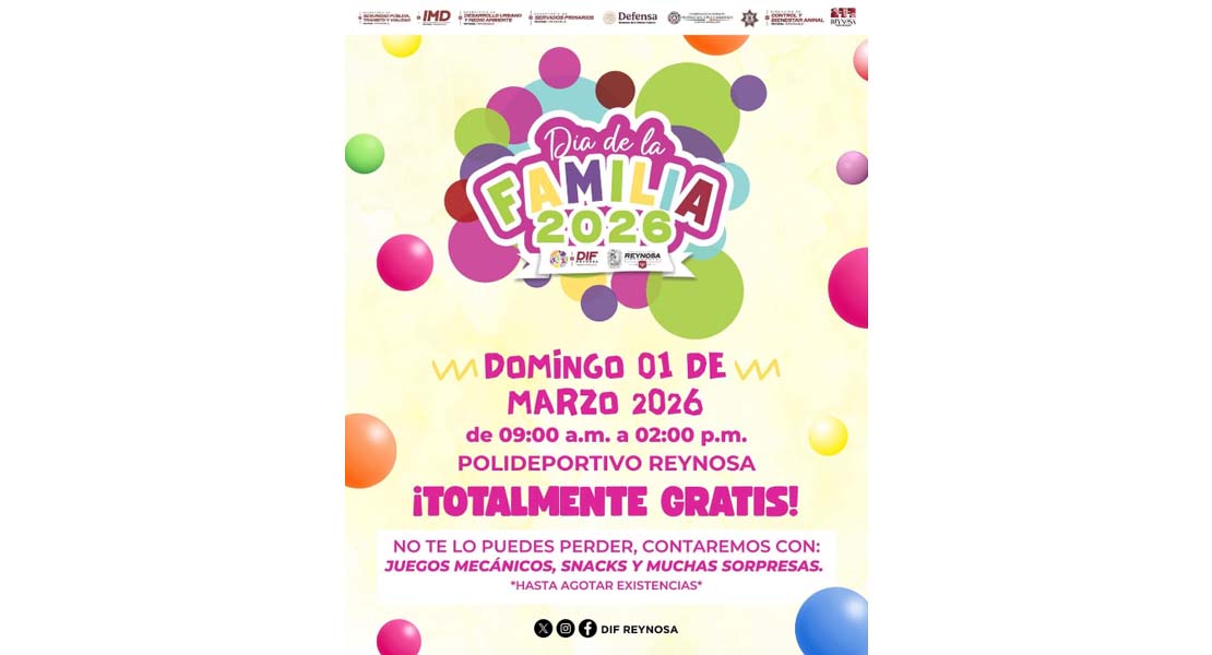 El Polideportivo Reynosa es el recinto donde se celebra el Día de la Familia, aún puede acudir hasta las 2:00 P. M. para disfrutar de la exhibición de vehículos de la SEDENA, Protección Civil y la participación de la Policía Vial, pinta caritas, peinados locos, snacks y muchas sorpresas para chicos y grandes.