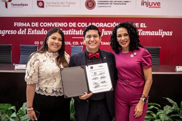 Ciudad Victoria, Tamaulipas (4-Marzo-2026).- El Instituto de la Juventud de Tamaulipas (INJUVE) y el Congreso del Estado firmaron un convenio de colaboración, acuerdo que fue signado por el diputado presidente del Congreso, Humberto Armando Herrera Prieto, y el director general del INJUVE, Óscar Azael Rodríguez Perales, que tiene como objetivo impulsar programas y proyectos que beneficien a la juventud tamaulipeca, en busca de fomentar la participación ciudadana y el liderazgo juvenil.
