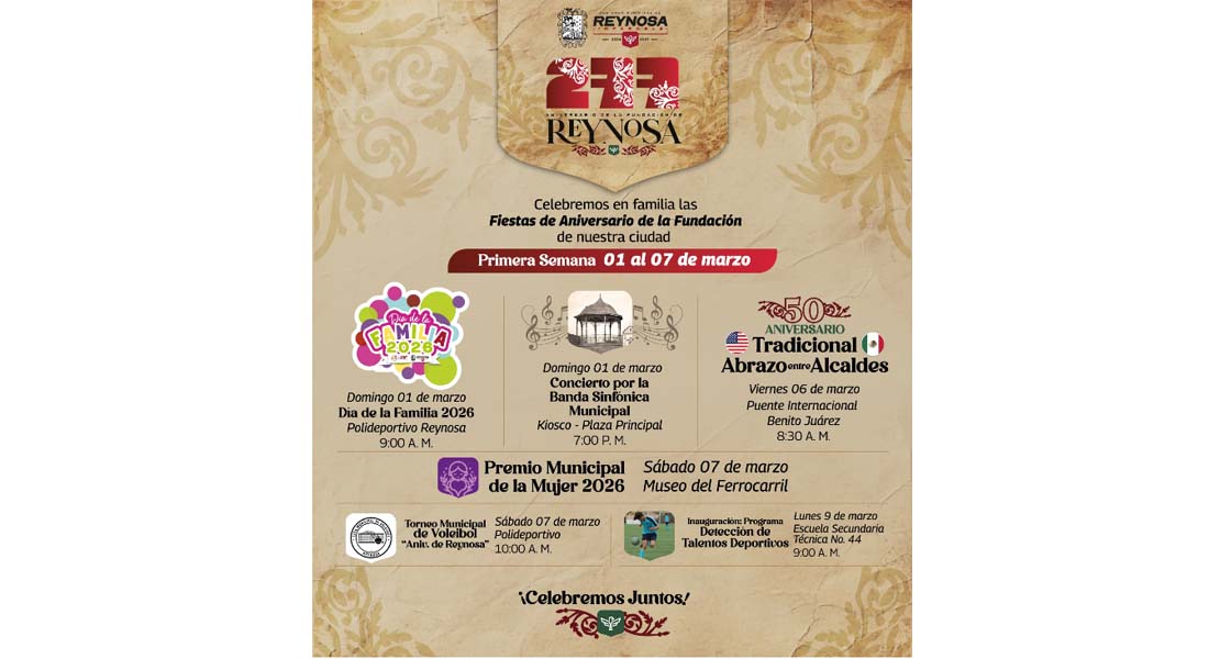 Reynosa, Tam (4-Marzo-2026).- El Presidente Municipal Carlos Peña Ortiz invita a las familias locales, de la región y del Valle del Sur de Texas a disfrutar los festejos del 277 Aniversario de la Fundación de Reynosa, celebremos del 1 al 21 de marzo esta gran fiesta.