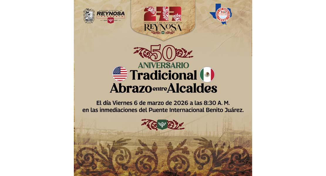 Reynosa, Tam (5-Marzo-2026).- El Presidente Municipal de nuestra ciudad, Carlos Peña Ortiz, protagonizará el Tradicional Abrazo binacional con su homólogo el Mayor de Hidalgo, Texas, Sergio Coronado, en los 50 Años de esta celebración que estará enmarcada en la conmemoración del 277 Aniversario de la Fundación de Reynosa.