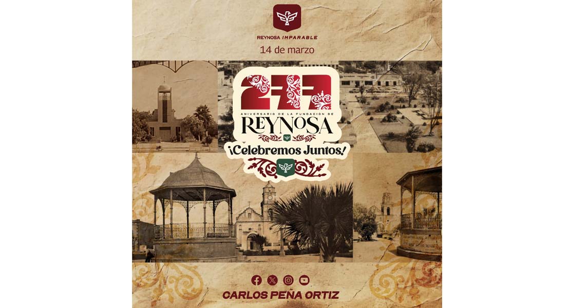 Reynosa, Tam (12-Marzo-2026).- El Presidente Municipal Carlos Peña Ortiz invita a la población en general a la ceremonia del 277 Aniversario de la Fundación de Reynosa, que se llevará a cabo el próximo sábado 14 de marzo a las 8:30 de la mañana en la plaza Capitán Carlos Cantú de congregación Reynosa Díaz, cuna de esta ciudad.