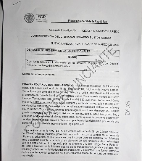 NUEVO LAREDO, TAM.- Por robo de 13 mil pesos y agresiones, un padre de familia presentó una denuncia ante la Fiscalía General de la República (FGR) contra un grupo de militares, que le practicaron una revisión afuera de su domicilio en la colonia Buenavista.El denunciante Bryan Eduardo Bustos García de 23 años acudió a formalizar la denuncia acompañado de dos personas testigos de los hechos, el mecánico Jesús Gerardo Briones Hernández, de 27 años, y su cuñado, Edgar Noé Gómez Zúñiga, de 25 años.