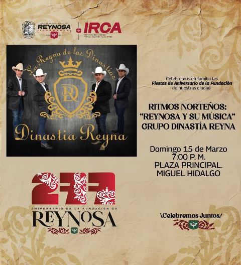 Reynosa, Tam (15-Marzo-2026).- El Presidente Municipal Carlos Peña Ortiz invita a la población de la región a disfrutar del arte y la cultura en la conmemoración del 277 Aniversario de la Fundación de Reynosa, en las plazas Miguel Hidalgo y Treviño Zapata, hoy domingo 15 de marzo.