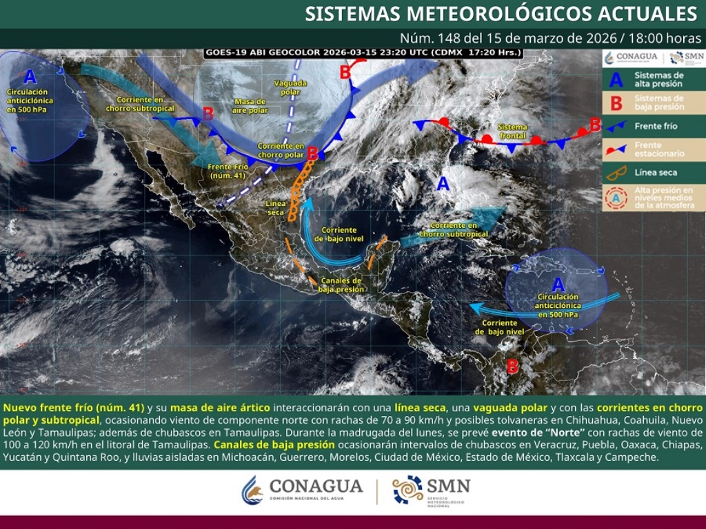 Reynosa, Tam (15-Marzo-2026).- El Gobierno Municipal de Reynosa ofrece la información sobre el estado del tiempo en este inicio de semana. Después de un domingo caluroso con temperatura de hasta 40° Centígrados, el Frente Frío 41 provocará este lunes 16 de marzo, máxima de 21°, mínima de 11° y viento muy fuerte.