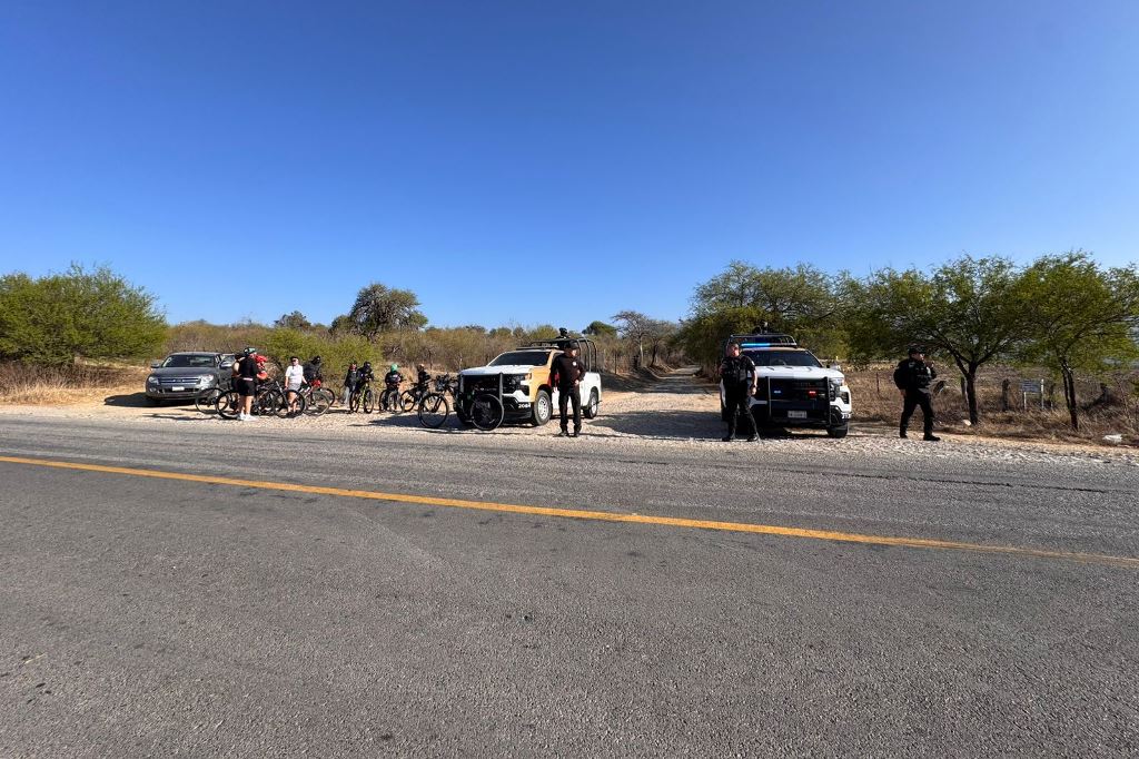 Tula, Tamaulipas (21-Marzo-2026).- Personal de la Guardia Estatal brinda apoyo de seguridad y resguardo perimetral durante la realización de la “Rodada x Tamaulipas”, encabezada por el ciclista de alto rendimiento César Vallejo Ledezma, en un recorrido efectuado sobre la carretera estatal 66, en el tramo Tula–Ocampo.