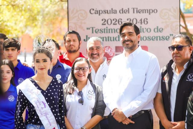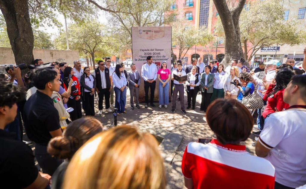 Reynosa, Tam (21-Marzo-2026).- El Presidente Municipal Carlos Peña Ortiz acompañado por su esposa Alejandra Yelitza Garza, participó en la colocación de una Cápsula del Tiempo con jóvenes del Consejo Consultivo Juvenil y alumnos de la Unidad Académica Multidisciplinaria Reynosa Aztlán-UAT, y de la Universidad Tamaulipeca.