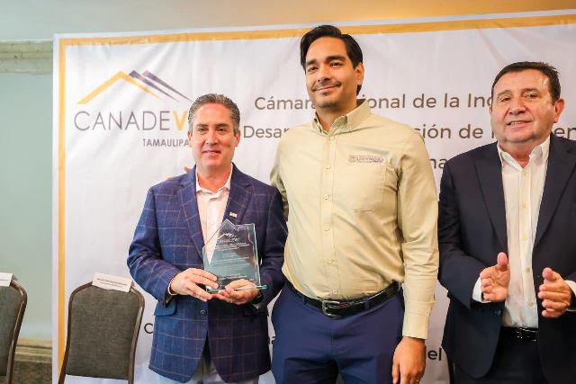Reynosa, Tam (26-Marzo-2026).- La Cámara Nacional de la Industria de Desarrollo y Promoción de la Vivienda, CANADEVI, reconoció el apoyo visión y vocación constructivista del Presidente Municipal de Reynosa, Carlos Peña Ortiz, en una Asamblea Estatal en la que el dirigente nacional del organismo, Carlos Ramírez Capó, tomó protesta al Delegado en Tamaulipas, Roberto Danwing Marroquín.