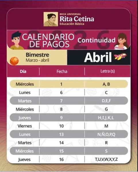 Para las familias beneficiarias de continuidad de la Beca de Educación Básica “Rita Cetina”, el pago correspondiente al bimestre marzo-abril se llevará a cabo del 1 al 16 de abril. En este caso, el calendario se organiza con base en la letra inicial del primer apellido de la madre o del padre. El monto bimestral de la beca es de $1,900 + $700 por cada hijo(a) adicional que estudie en la secundaria.