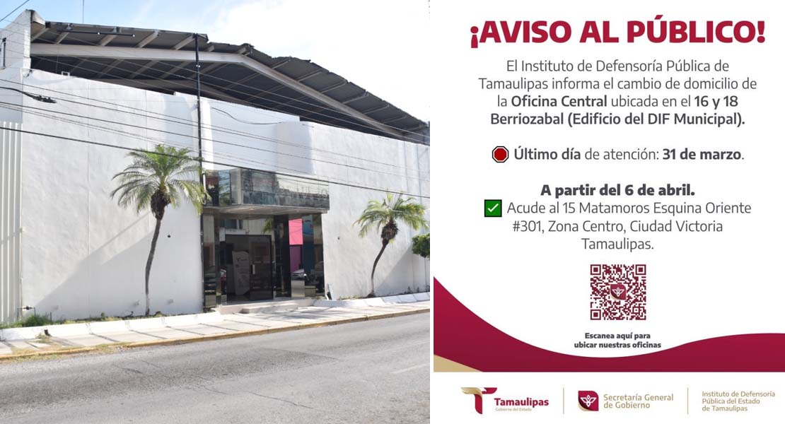 Ciudad Victoria, Tamaulipas (31-Marzo-2026).- El Instituto de Defensoría Pública del Estado de Tamaulipas informa a la ciudadanía sobre el cambio de domicilio de sus oficinas en Ciudad Victoria, con el objetivo de fortalecer la atención y mejorar los servicios jurídicos que se brindan a la población.