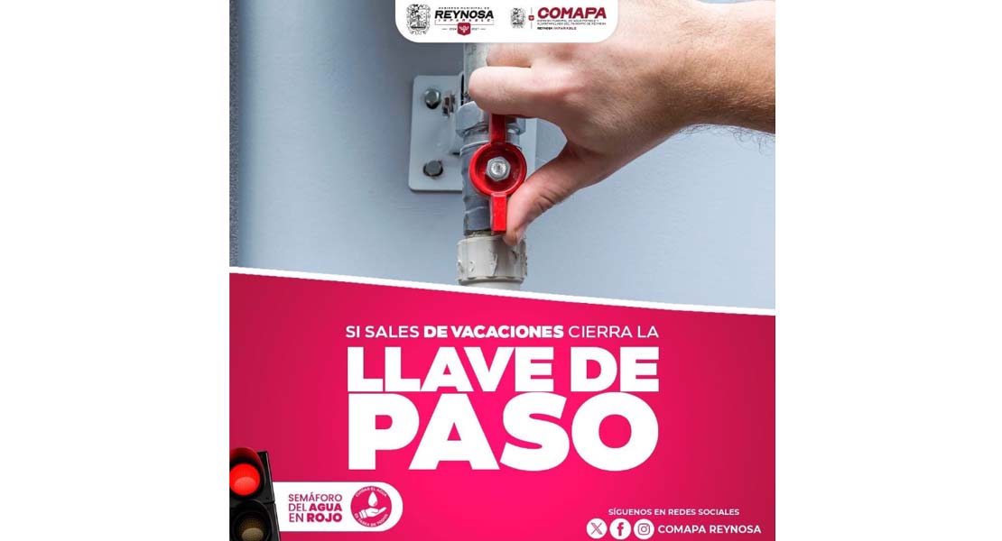 Reynosa, Tam (1-Abril-2026).- Con el objetivo de fomentar la cultura del cuidado del agua y prevenir incidentes en los hogares, la Comisión Municipal de Agua Potable y Alcantarillado de Reynosa exhorta a los usuarios que saldrán de la ciudad en este periodo vacacional a cerrar la llave de paso de sus domicilios.