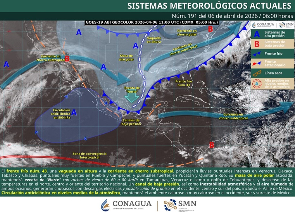 Reynosa, Tam (6-Abril-2026).- El Frente Frío Número 43 dejó para esta región temperaturas agradables, la máxima para hoy lunes 6 de abril será de 24° Centígrados y mínima de 14°; con ligero cambio para el día martes 7 con 28° máxima y mínima de 18°; con ausencia de probabilidad de lluvias.