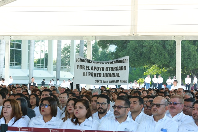 Al presidir la ceremonia de honores en la explanada del Supremo Tribunal de Justicia, frente al monumento a Benito Juárez y acompañado por la magistrada presidenta Tania Contreras López, el gobernador destacó la nivelación salarial que impacta al 85% de las y los trabajadores del Poder Judicial, con incrementos que van desde el 22% hasta por arriba del 100% en algunas posiciones que estaban muy rezagadas.