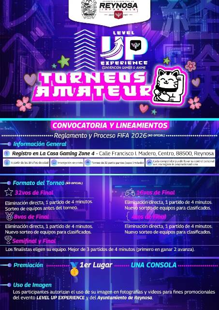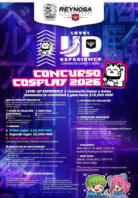Reynosa, Tam (14-Abril-2026).- El Gobierno Municipal de Reynosa te convoca al Gamer & Anime 2026, LEVEL UP Experience, que celebra la cultura gamer, el anime y el entretenimiento digital, reuniendo a talentos, creadores y fans en un espacio de creatividad, competencia y expresión artística, concursos, torneos, doblaje, show match y mucho más.