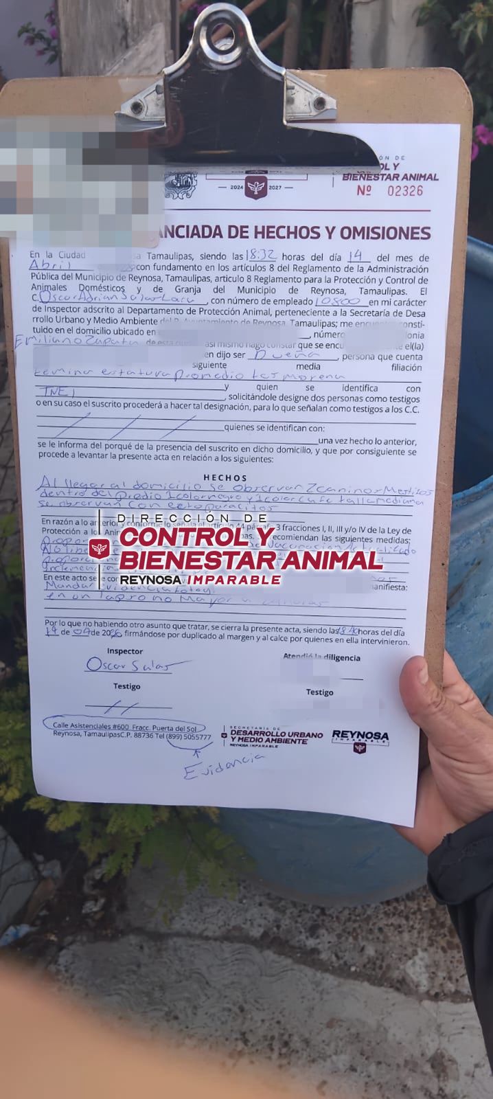 Reynosa, Tam (17-Abril-2026).- El Alcalde Carlos Peña Ortiz fortalece la atención a reportes ciudadanos en favor del bienestar animal, a través de la Dirección de Control y Bienestar Animal, y da seguimiento de forma puntual las denuncias para garantizar la seguridad de las familias y el trato digno a las mascotas.