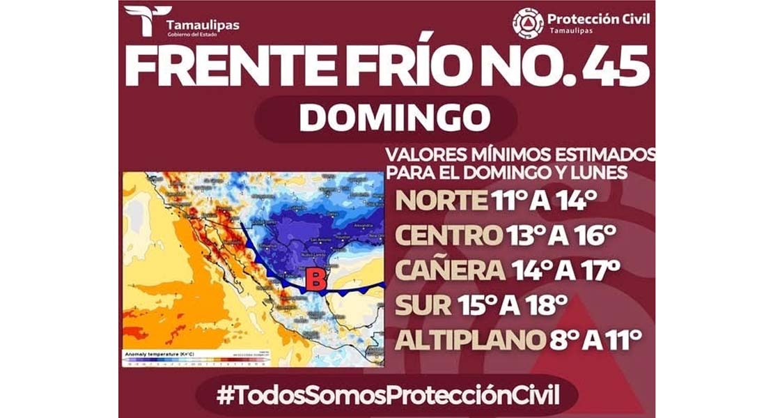 Ciudad Victoria, Tamaulipas (17-Abril-2026).- La Coordinación Estatal de Protección Civil Tamaulipas informa que, de acuerdo con los pronósticos meteorológicos, este sábado por la noche ingresará a la entidad, un frente frío que provocará descenso de temperaturas, lluvias y vientos del norte con velocidades de entre 45 y 65 kilómetros por hora.