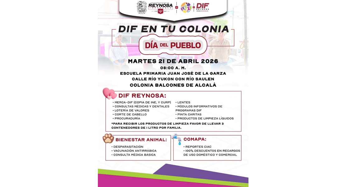Reynosa, Tam (19-Abril-2026).- El Sistema DIF-Reynosa que encabeza Carlos Luis Peña Garza, invita a las familias a participar en la brigada “DIF en Tu Colonia», que se realizará el próximo martes 21 de abril a partir de las 08:00 de la mañana, en la Escuela Primaria «Juan José de la Garza», ubicada en la colonia Balcones de Alcalá.