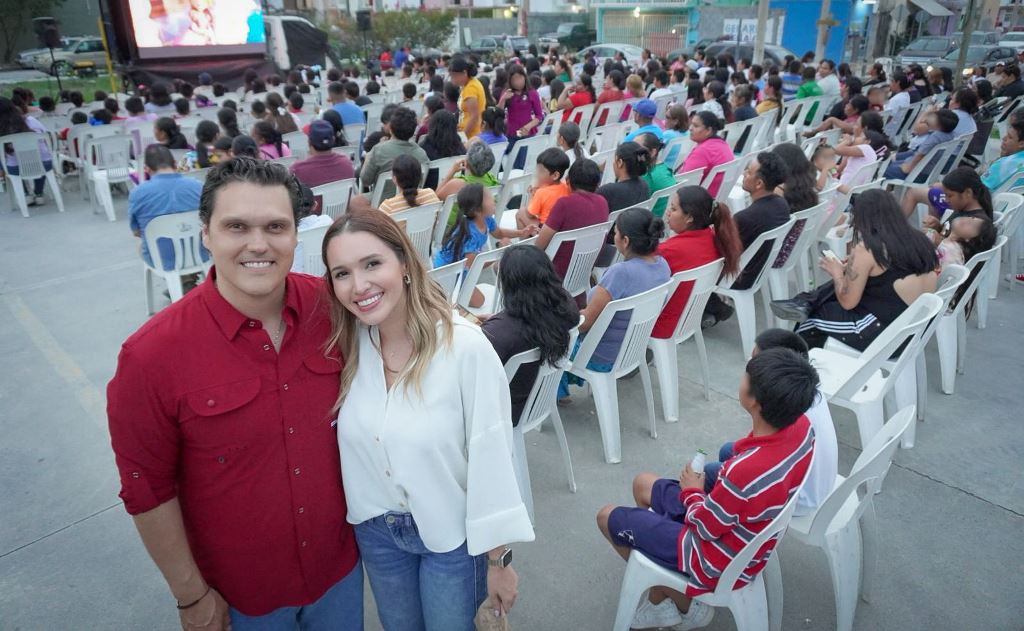 Continuando con la celebración del Día del Niño, el presidente de la JUGOB, Humberto Prieto, junto a su esposa Verónica Garza de Prieto, llevó el cine a este sector, dándose cita niñas, niños y adultos vecinos del sector.