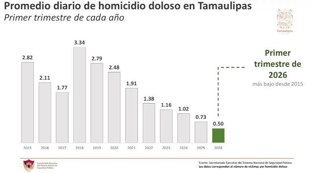 El Secretariado Ejecutivo del Sistema Nacional de Seguridad Pública detalló que durante el primer trimestre de 2026, Tamaulipas consolidó esta tendencia a la baja, la cual se ha registrado desde el inicio de la actual administración estatal.