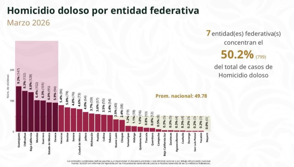 A nivel nacional, más del 50% de homicidios dolosos se concentran en siete estados del país, con un total de 799 casos: Guanajuato, Chihuahua, Baja California, Morelos, Guerrero, Estado de México y Oaxaca, de acuerdo con los datos presentados en la conferencia matutina del 14 de abril de la presidenta Claudia Sheinbaum.