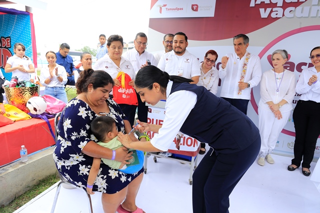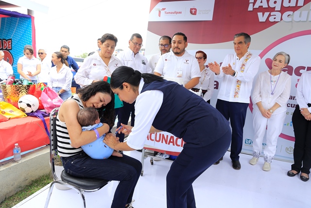 En el marco de la magna celebración DIFZania, en el recinto ferial de esta capital, junto con la doctora María de Villarreal, presidenta del DIF Tamaulipas, el gobernador aplicó las primeras dosis de la vacuna hexavalente y de la vacuna contra el sarampión a cuatro menores de edad.