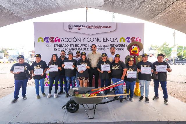 Reynosa, Tam (25-Abril-2026).- El Presidente Municipal Carlos Peña Ortiz, fue recibido entre vivas y aplausos por las familias del fraccionamiento Halcón, durante el cierre del programa Acción y Conciencia desarrollado por Servicios Públicos con el objetivo de fortalecer la participación ciudadana y fomentar el cuidado de los espacios comunes.