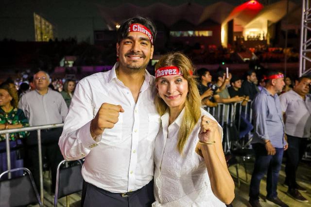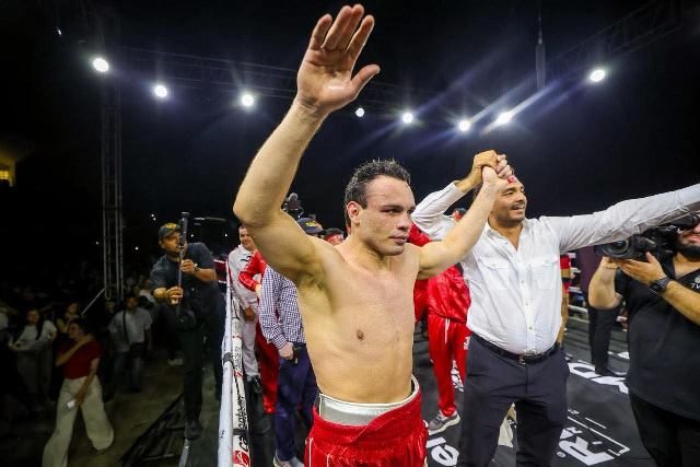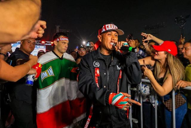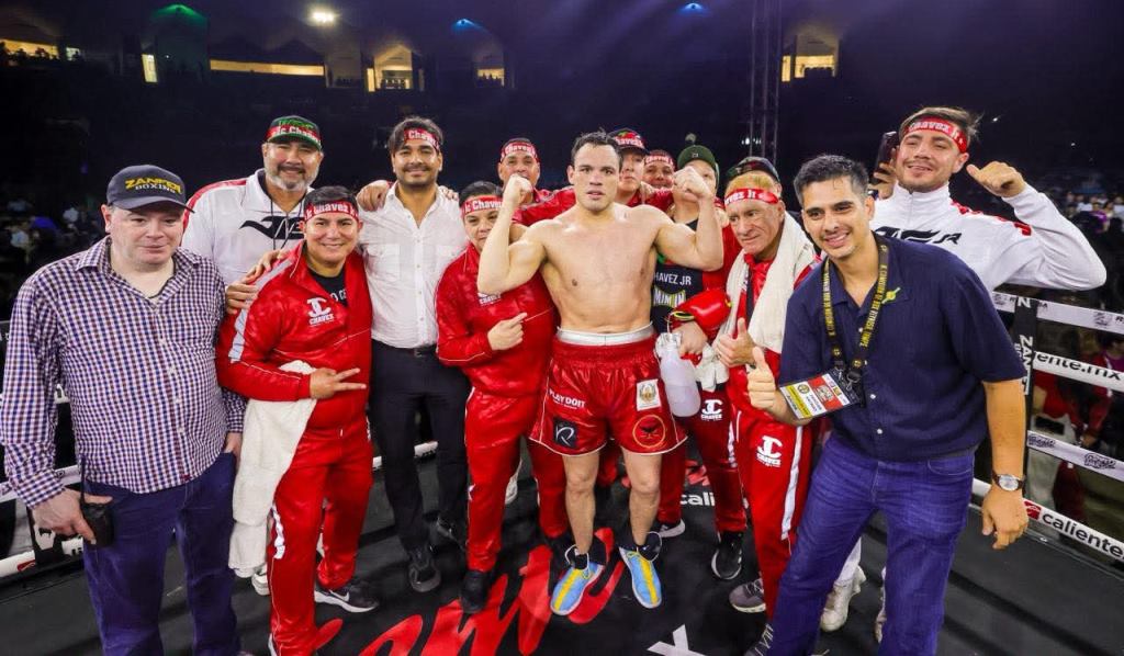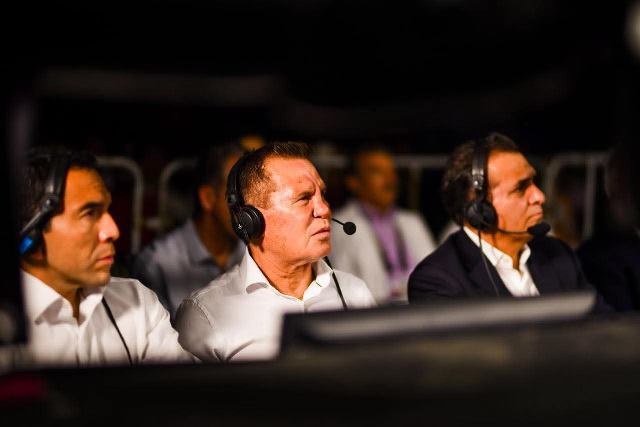 Reynosa, Tam (26-Abril-2026).- El Presidente Municipal Carlos Peña Ortiz acompañado por el Campeón Mundial Julio César Chávez expresó al boxeador profesional Julio César Chávez Jr, su felicitación por el triunfo obtenido al derrotar en el ring, por nocaut técnico, al colombiano Jhon Caicedo, en el parque de beisbol Adolfo López Mateos que recibió a más de 10 Mil aficionados.