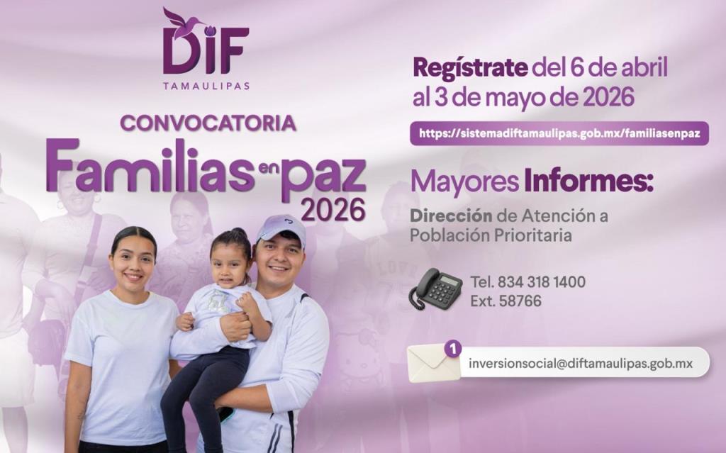 Ciudad Victoria, Tamaulipas (27-Abril-2026).- Con la finalidad de incidir en el bienestar y el desarrollo de la población de atención prioritaria por medio de iniciativas de asistencia social, el Sistema DIF Tamaulipas, que preside la doctora María de Villarreal, invita a las organizaciones civiles donatarias a participar en la convocatoria “Familias en Paz 2026”, la cual contempla apoyo económico para la implementación de proyectos sociales.