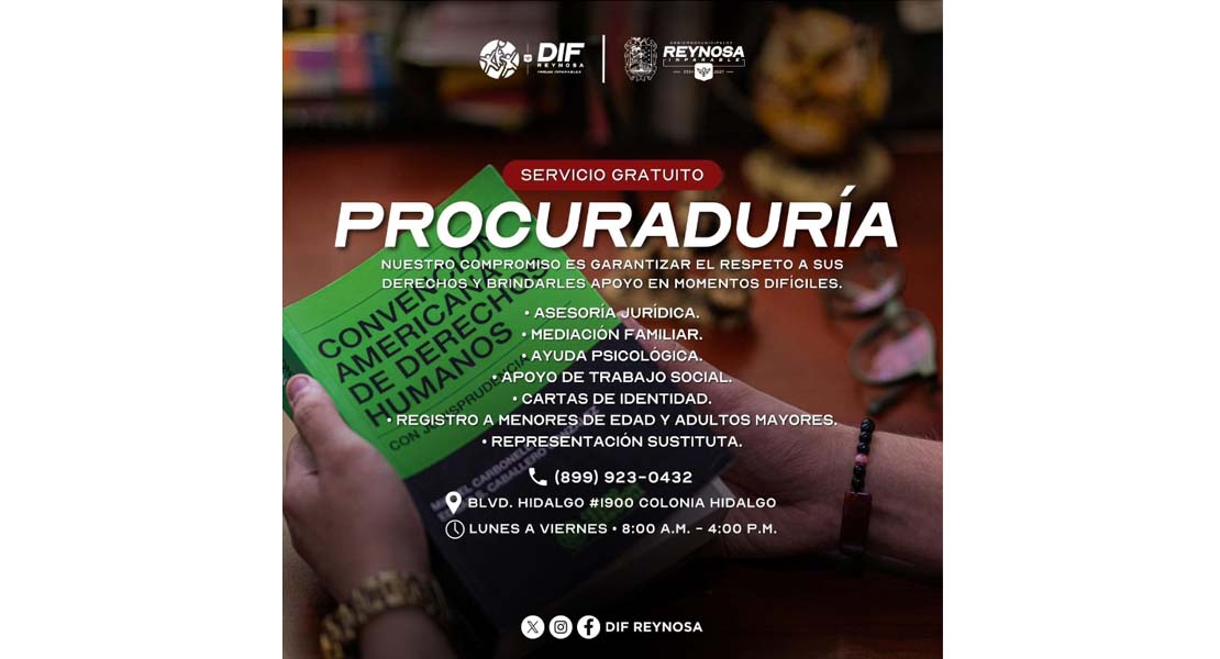 Reynosa, Tam (28-Abril-2026).- El Sistema DIF-Reynosa que preside Carlos Luis Peña Garza, pone a disposición de la ciudadanía el servicio de apoyo legal, a través del área de Procuraduría, con el objetivo de brindar orientación y respaldo a quienes enfrentan alguna situación jurídica.